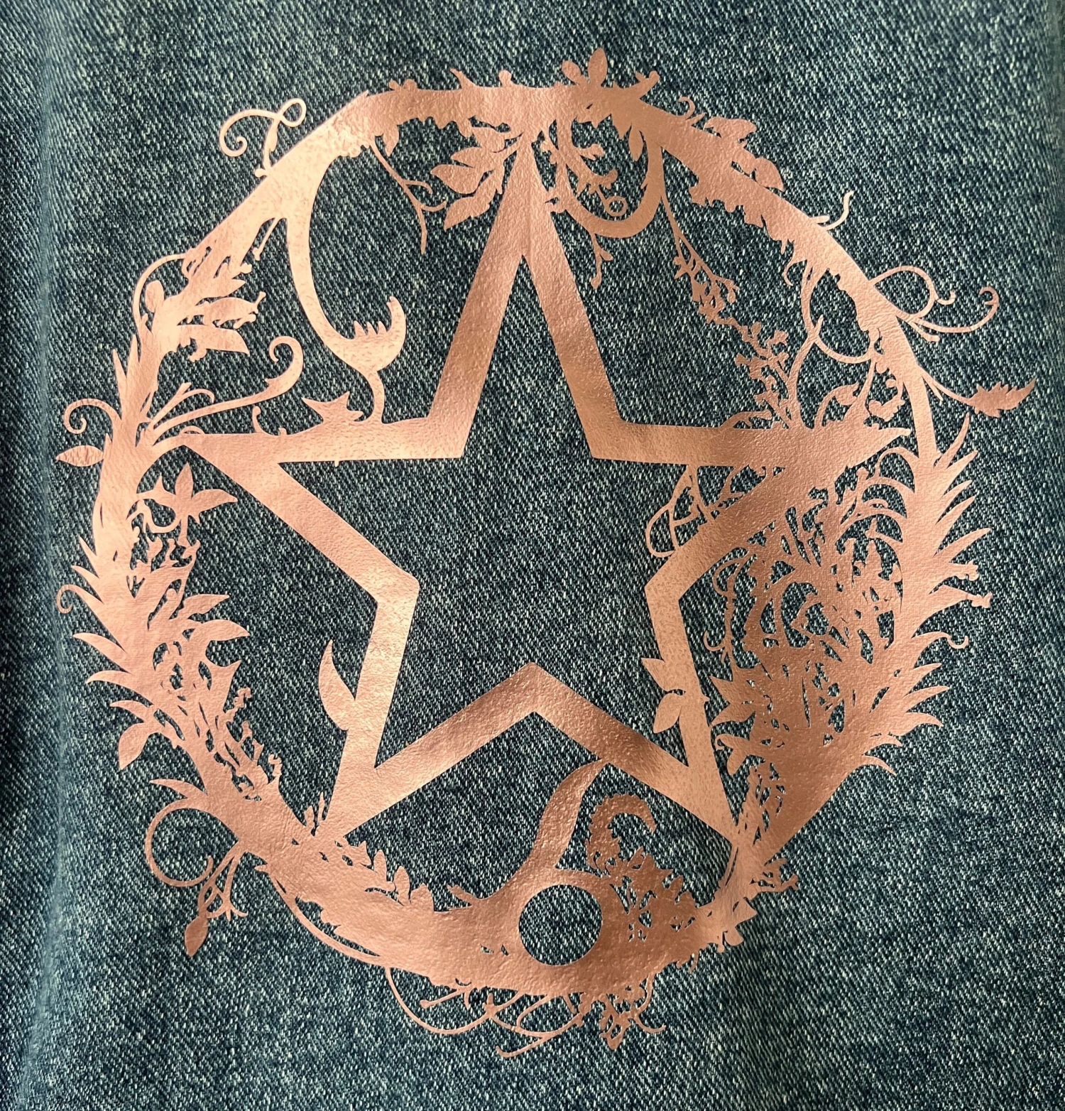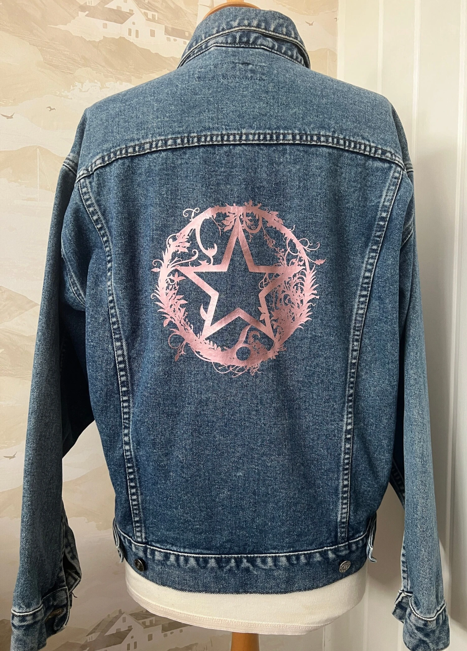 We have rescued this really cool denim jacket that is in fab condition with plenty of life left in it. We only print our designs onto pre-loved items that are in excellent condition. We have printed our brand-new design to the back of the jacket; this includes a very pretty rose gold star within a leafy circle. You will not find another one exactly like this one!